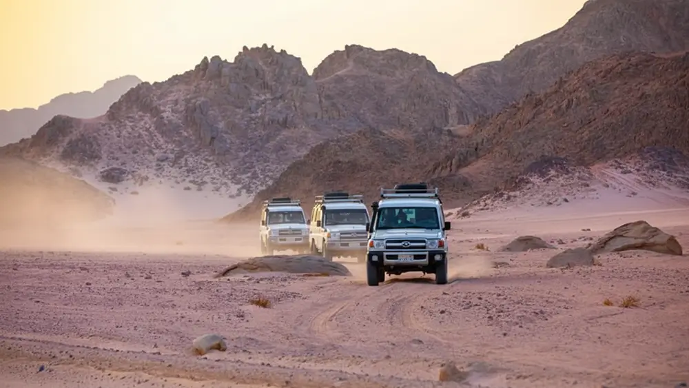 Wenn Sie den Jeep betreten und Hurghada langsam hinter sich lassen, beginnt die Wüste sich zu öffnen. Die Geräusche werden leiser, die Luft klarer und der Horizont weiter. Genau so startet diese VIP Jeep safari.