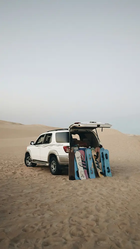 Diese Tour vereint ruhige Strecken, kleine Highlights und die offene Landschaft der Wüste. Sie erleben die Fahrt im Jeep, den Besuch im Beduinendorf, das Sandboarding und den Sonnenuntergang an einem Ort, der wie für diesen Moment gemacht ist.