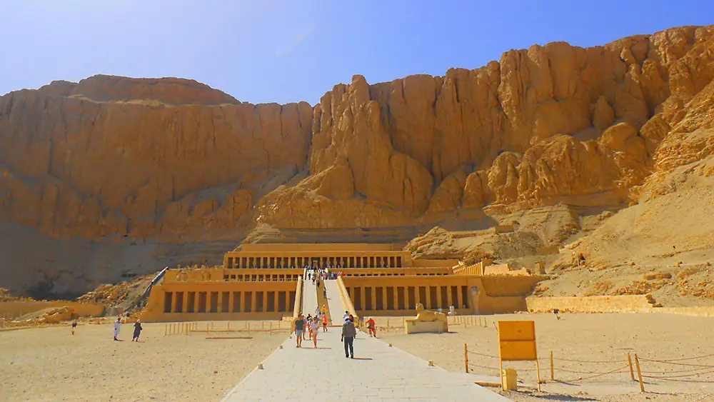 Weiter geht es zum prächtigen Tempel der Hatschepsut, errichtet zu Ehren der einzigen weiblichen Pharaonin Ägyptens. Das Bauwerk ist ein Meisterwerk der Architektur, harmonisch in den Felsen eingebettet. Auf dem Rückweg halten Sie bei den Memnon-Kolosse, zwei imposanten Statuen, die einst den Eingang eines gewaltigen Tempels bewachten.